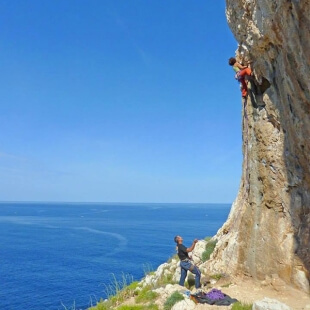 Der kompakte Fels bietet mit fixierten Bohrhaken sichere Bedingungen. Die Umgebung bietet zudem einen herrlichen Panoramablick über die Küste von Alghero.
